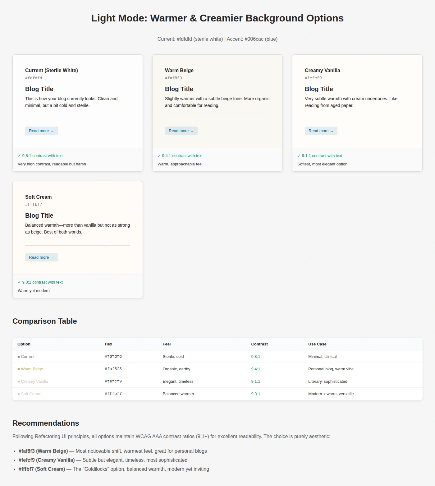 I remembered seeing a post on Hacker News many years ago about subtle design principles for a better overall look, and wanted to see if I could apply them to the blog theme. Using Claude (on the web) to help me search for it, I found it: 7 Practical Tips for Cheating at Design. I won’t just repeat content from that post, but I was mostly inspired by the use of colour accent borders, and using text colour and weight to signify importance, specifically the interactions between foreground and background colours.